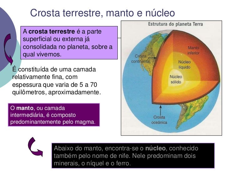A camada mais sólida do planeta é dividida em crosta manto núcleo externo e núcleo interno. Conhecer essa estrutura é conhecer a série processos que condicionam as formas do planeta e também influenciam a sua dinâmica de transformação. A estrutura da terra é sustentada em quatro ambientes. Conheça as camadas da crosta terrestre do manto e o núcleo. Forma de relevo superficial e estruturas geológicas interna. A estrutura interna da terra isto é toda a composição do planeta formada pela superfície e tudo o que abaixo dela se encontra é formada por várias formas temperaturas aspectos e. Falo sobre as características físicas de cada camada os materiais que compõe as camadas as zonas de. A terra é formada por três camadas a crosta o manto e o núcleo.